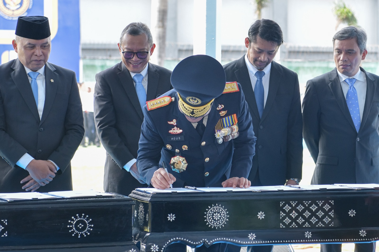 Direktur Utama PT Bank Tabungan Negara (Persero) Tbk (BTN) Nixon LP Napitupulu (kanan) dan Menteri Imigrasi dan Pemasyarakatan RI Jenderal Pol. (Purn) Agus Andrianto (kiri) menandatangani nota kesepahaman bersama para pimpinan kementerian dan lembaga lainnya saat upacara Peringatan Hari Bhakti Kementerian Imigrasi dan Pemasyarakatan ke-1 Tahun di Lembaga Pemasyarakatan (Lapas) Kelas IIA Narkotika Jakarta, Jatinegara, Jakarta Timur, Rabu (19/11). Penandatanganan ini menandai penguatan sinergi BTN dalam penyediaan dan pemanfaatan produk perbankan di lingkungan Kementerian Imigrasi dan Pemasyarakatan RI