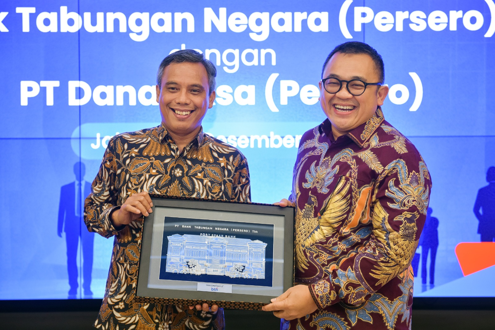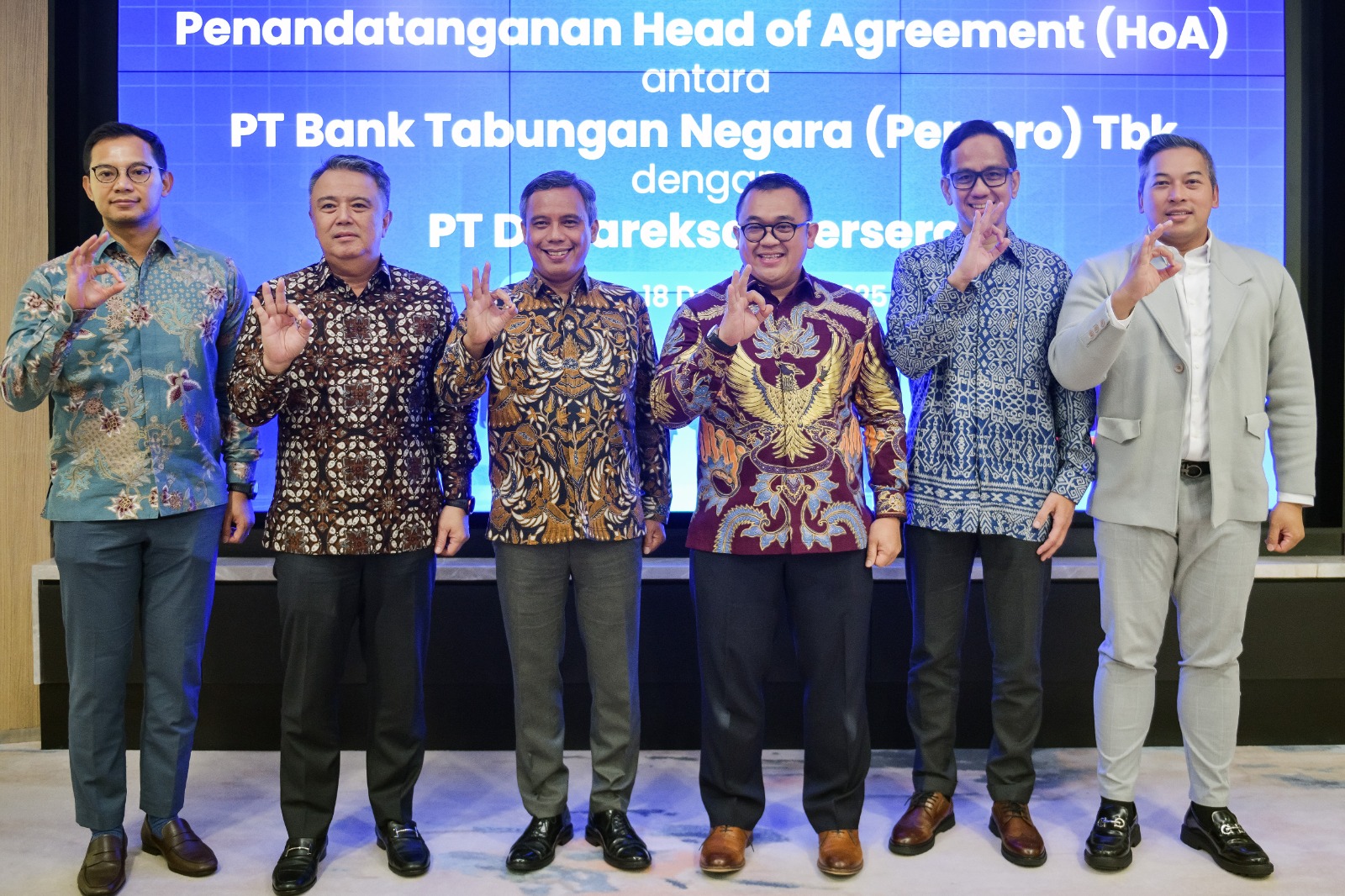 Direktur Utama PT Bank Tabungan Negara (Persero) Tbk, Nixon LP Napitupulu, dan Direktur Utama PT Danareksa (Persero), Yadi Jaya Ruchandi, menunjukkan dokumen Kesepakatan Pendahuluan (Head of Agreement/HoA) usai penandatanganan kerja sama strategis antara BTN dan Holding BUMN Danareksa di Menara 2 BTN, Jakarta, Kamis (18/12/m). Melalui kerja sama tersebut, BTN menyiapkan plafon fasilitas pembiayaan hingga Rp4,5 triliun yang terdiri dari Committed Corporate Line Facility dan Uncommitted Corporate Line Facility, serta menyediakan layanan perbankan terintegrasi untuk mendukung pengelolaan keuangan dan ekspansi bisnis seluruh ekosistem holding Danareksa. Kerja sama ini menjadi bagian dari upaya BTN untuk memperkuat perannya sebagai mitra perbankan utama bagi holding korporasi berskala besar, termasuk melalui pemanfaatan layanan cash management dan solusi perbankan digital melalui Bale Korpora