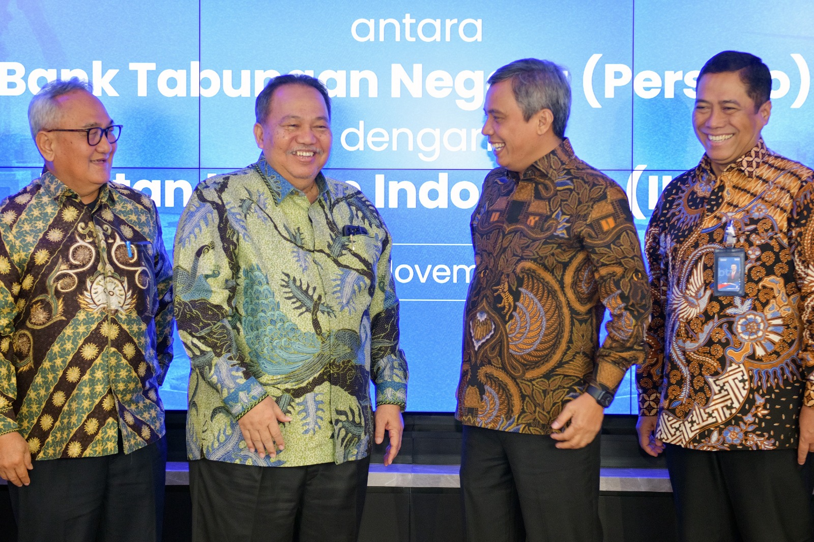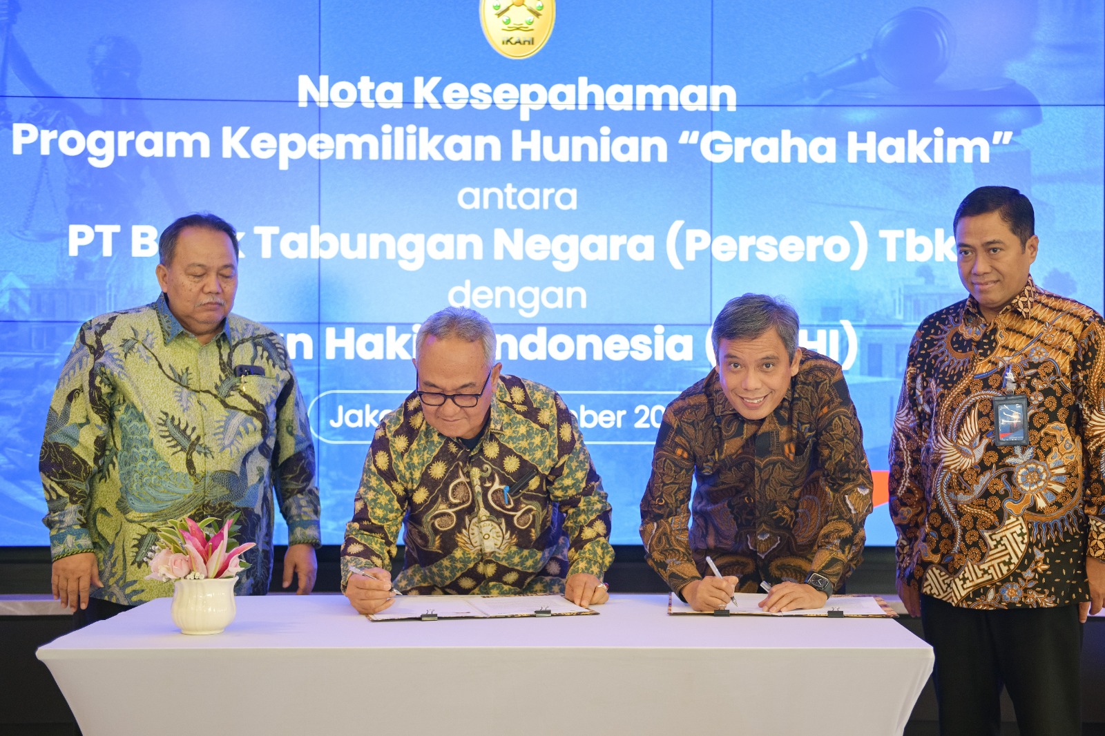 Direktur Utama PT Bank Tabungan Negara (Persero) Tbk (BTN) Nixon LP Napitupulu Bersama Ketua Umum Ikatan Hakim Indonesia (IKAHI) Hakim Agung Dr. H. Yasardin, S.H., M.Hum. (kedua kiri) menandatangani Nota Kesepahaman Program Kepemilikan Hunian “Graha Hakim” antara BTN dengan IKAHI yang disaksikan oleh Wakil Ketua Mahkamah Agung bidang Yudisial selaku pelindung IKAHI H. Suharto, S.H, M.Hum. (kiri) dan Direktur Consumer Banking BTN Hirwandi Gafar (kanan) di Menara 2 BTN, Jakarta, Selasa (11/11). Kerja sama strategis ini merupakan bagian dari upaya BTN memperluas penetrasi kredit konsumer di lingkungan aparatur negara, khususnya di kalangan hakim untuk mendapatkan kemudahan memiliki rumah dengan berbagai fasilitas menarik. Mulai dari suku bunga kompetitif, keringanan biaya akad, hingga kemudahan proses pengajuan Kredit Pemilikan Rumah (KPR). Akses terhadap hunian yang layak diharapkan dapat meningkatkan kesejahteraan dan stabilitas finansial para hakim. Oleh karena itu, BTN ingin hadir bukan hanya sebagai bank, tetapi juga sebagai teman perjalanan yang mendukung kesejahteraan hakim dan keluarganya