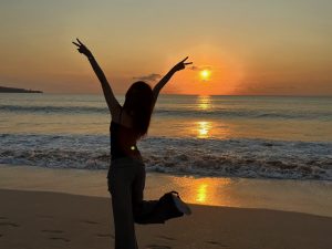 Melalui akun Weverse resmi Hearts2Hearts, Carmen membagikan beberapa foto liburannya. Salah satunya menampilkan pemandangan matahari terbenam khas Bali dengan siluet dirinya di tepi pantai. Dalam foto itu, Carmen berpose mengangkat satu kaki sambil membentuk huruf “V” dengan kedua tangannya.