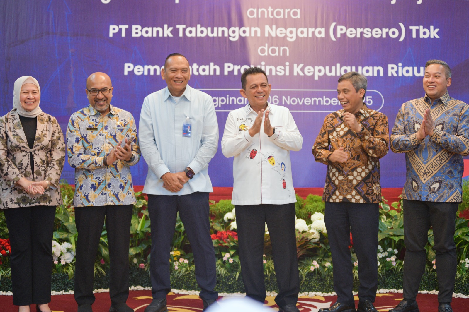 Direktur Utama PT Bank Tabungan Negara (Persero) Tbk (BTN) Nixon LP Napitupulu (kedua kanan) bersama Gubernur Kepulauan Riau Ansar Ahmad (kedua kiri) menandatangani kesepakatan kerja sama strategis antara BTN dan Pemerintah Provinsi Kepulauan Riau di Tanjung Pinang, Kamis (6/11), disaksikan oleh Penjabat (Pj) Sekretaris Daerah Provinsi Kepulauan Riau Luki Zaiman Prawira (kiri) dan Komisaris Independen BTN Pietra Machreza Paloh (kanan). Kerja sama ini mencakup pengelolaan dana, digitalisasi keuangan daerah, serta penyediaan pembiayaan rumah bagi aparatur sipil negara (ASN) di Kepri