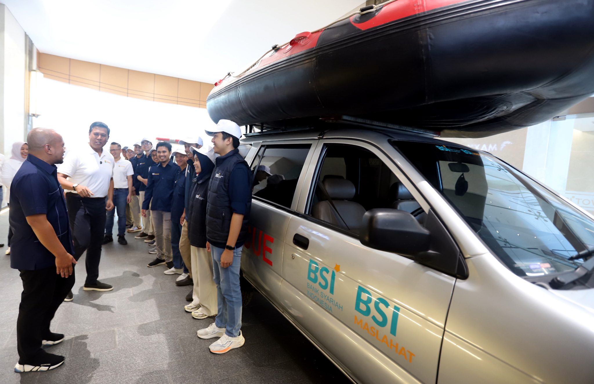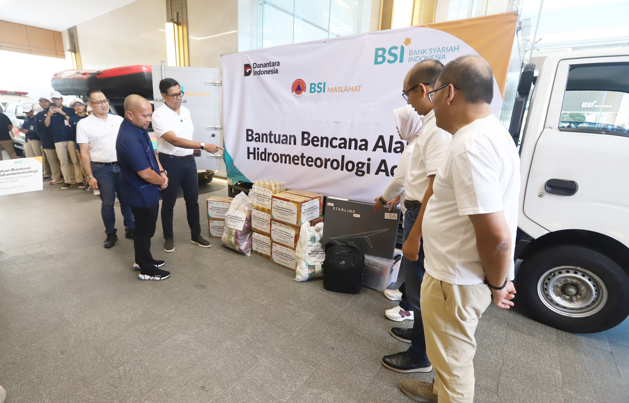 (kiri-kanan) Direktur Information Technology BSI Muharto Hadi Suprapto, Direktur Compliance & Human Capital (berlaku efektif setelah lulus fit and proper OJK) BSI Arief Adhi Sanjaya, Direktur Utama BSI Anggoro Eko Cahyo, Utusan Khusus Gubernur Aceh Chowadja Sanova, SEVP Operation BSI Ana Nurul Khayati, Direktur Risk Management BSI Grandhis H Harumansyah, Direktur Eksekutif BSI Maslahat Sukoriyanto Saputro (paling kanan) melepas bantuan dan relawan BSI Maslahat menuju Aceh.Jakarta,Sabtu (29/11). PT Bank Syariah Indonesia Tbk (BSI) menyatakan dukungan kemanusiaan untuk masyarakat Aceh. Hal ini dilakukan melalui bantuan bertahap dengan total 15ton kebutuhan logistik berupa perahu karet, sembako,susu, obat-obatan, alat komunikasi dan pendukung lainnya