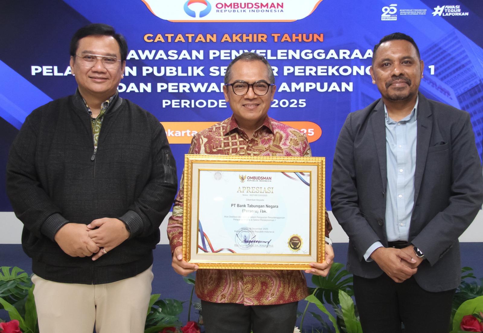 Direktur Human Capital & Compliance PT Bank Tabungan Negara (Persero) Tbk, Eko Waluyo (tengah) tersenyum usai menerima apresiasi dari Pimpinan Ombudsman RI, Yeka Hendra Fatika, dan Kepala Keasistenan Utama III Ombudsman RI, Yustus Y. Maturbongs di Kantor Ombudsman RI, di Jakarta, Kamis (18/12). BTN kembali mendapatkan apresiasi sebagai Mitra Strategis Pelayanan Publik Sektor Perekonomian I dari Ombudsman Republik Indonesia. Penghargaan ini sejalan dengan komitmen BTN dalam memberikan pelayanan terbaik bagi masyarakat Indonesia serta menjaga kepercayaan publik melalui penerapan tata kelola yang baik, kepatuhan terhadap regulasi, dan peningkatan kualitas layanan secara berkelanjutan. Bagi BTN, apresiasi ini menjadi pengakuan sekaligus motivasi untuk terus memperkuat peran sebagai mitra strategis pemerintah dalam mendorong pelayanan publik yang transparan, akuntabel, dan berorientasi pada kebutuhan masyarakat, khususnya dalam mendukung sektor perumahan dan perekonomian nasional