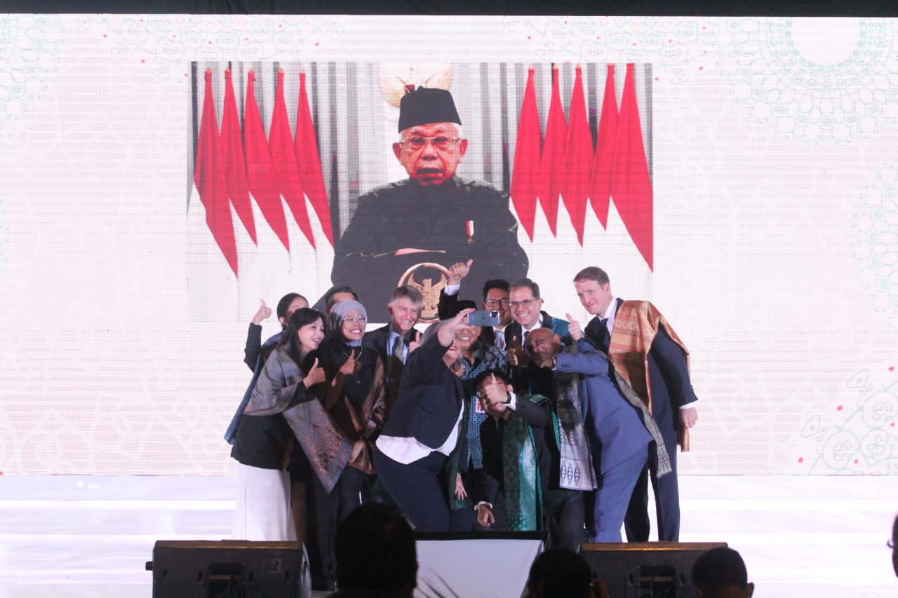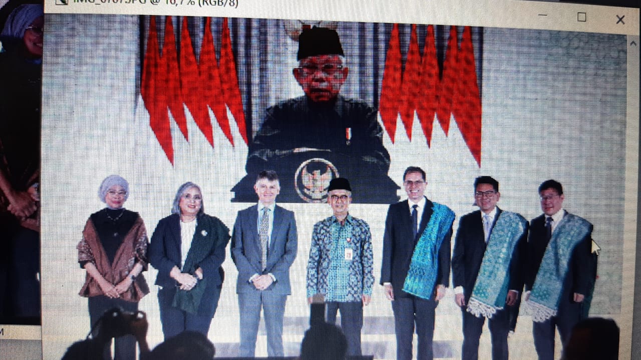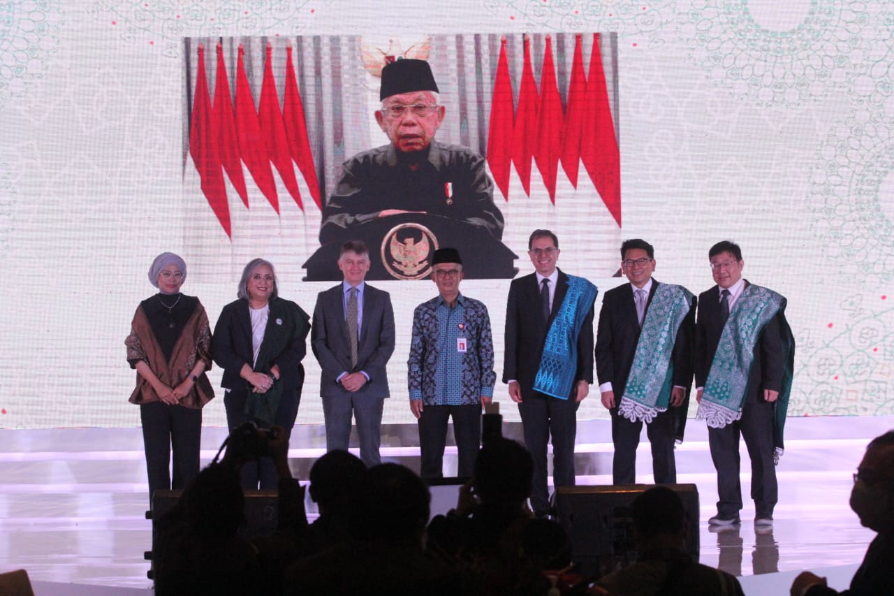 K.H. Ma’ruf Amin, Wakil Presiden Republik Indonesia yang hadir melalui tayangan video turut mengucapkan selamat dan memberikan arahan. Tampak berfoto bersama (ki-ka): Indrijati Rahayoe, Chief Human Resources, Community Investment, Risk & Compliance Officer; M. L. Triwardhany, Presiden Direktur Prudential Indonesia; H.E. Owen Jenkins, Duta Besar Inggris untuk Indonesia dan Timor Leste; Mochammad Ihsanuddin, Deputi Komisioner Pengawas Industri Keuangan Non Bank II Otoritas Jasa Keuangan (OJK); Nic Nicandrou, Chief Executive Prudential Asia & Africa; Omar Sjawaldy Anwar, Presiden Direktur Prudential Syariah; dan Paul Setio Kartono, Chief Financial Officer Prudential Syariah