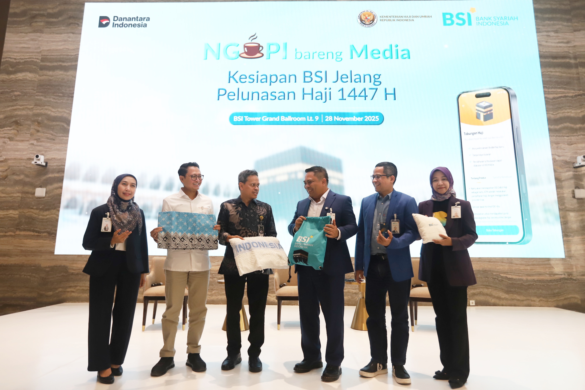 (kiri-kanan). Simbolik kesiapan pelayanan ibadah haji dilakukan oleh Kepala Biro Humas Kementerian Haji dan Umrah RI Hasan Afandi (kiri) dan Direktur Sales & Distribution BSI Anton Sukarna (kanan) di BSI Tower Jakarta,Jumat (28/11). PT Bank Syariah Indonesia Tbk (BSI) menegaskan kesiapan layanan pelunasan Biaya Perjalanan Ibadah Haji (Bipih) bagi calon jamaah haji Indonesia 1447 Hijriah. Melalui seluruh kantor cabang BSI, e-channel BYOND by BSI, BSI Net Banking dan BSI Agen. Pemerintah melalui Kementerian Haji dan Umrah RI telah mengumumkan fase I pelunasan haji dimulai 24 November-23 Desember 2025 untuk keberangkatan haji 1447 Hijriah