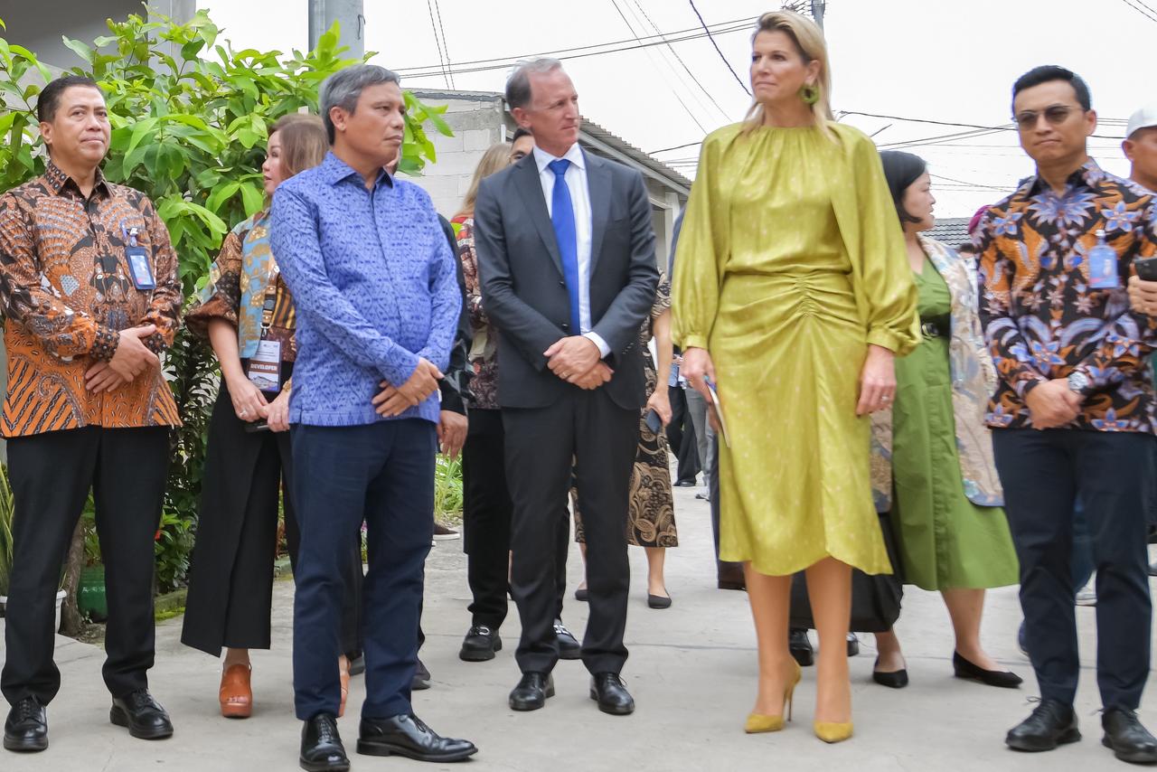 Queen Máxima (keempat kanan) berdiskusi dengan Direktur Utama PT Bank Tabungan Negara (Persero) Tbk, Nixon LP Napitupulu (kedua kanan), Direktur Risk Management BTN, Setiyo Wibowo (ketiga kanan), serta Direktur Consumer Banking BTN, Hirwandi Gafar (kanan), saat meninjau langsung proses akad Kredit Pemilikan Rumah (KPR) Subsidi bagi seorang sopir taksi di Perumahan Gran Harmoni Cibitung, Bekasi, Rabu (26/11). Selain menyaksikan akad KPR untuk masyarakat berpenghasilan rendah, Ratu Belanda juga berdialog dengan para debitur yang telah menempati rumah subsidi. Queen Máxima turut mengapresiasi implementasi program pembayaran angsuran KPR menggunakan sampah, sebuah terobosan BTN yang mendorong inklusi keuangan hijau, membantu mengurangi cicilan KPR, sekaligus berkontribusi pada pengurangan beban sampah nasional dari tingkat komunitas terkecil